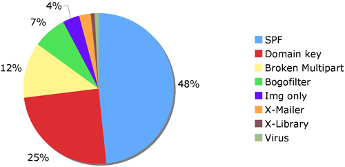 Spf 가 fail 난 경우에는 procmail 까지 메일이 넘어오지 않고 postfix 단에서 drop 되기 때문에, 실제로는 더 많은 스팸이 있었을 거라고 생각됩니다. 🙂