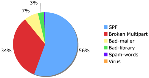6일부터 12일까지의 5077 개의 메일 중에 Spf 에 2482 개, Fake/NoHTML + Fake/NoPlain 에 걸린게 1499 개, BadMailer 에 315개, SpamWord 에 141 개, BadLibrary 에 21개, Virus 가 2개 되겠습니다.