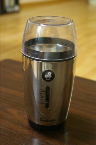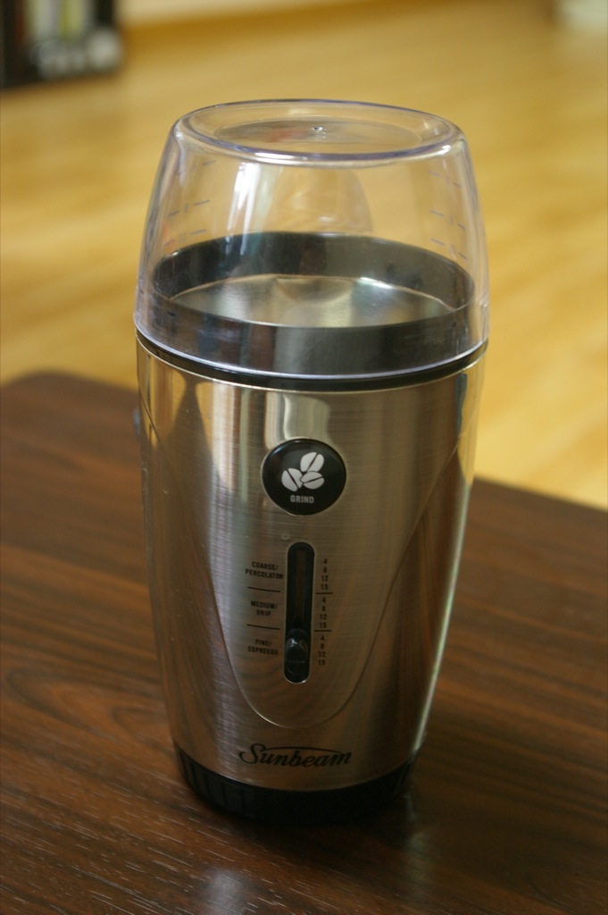 그라인더 몸체에 보면 갈리는 정도를 조절할 수 있는 레버가 있고, 제가 원하는 정도에 레버를 맞춘뒤 동그란 버튼을 누르면 설정에 맞춰서 가는 시간을 알아서 조절해줍니다. 얼마 전까지는 그라인더가 없었기 때문에 갈려있는 커피를 주문했었는데 이젠 그럴 필요가 없기 때문에 -_-v 과감하게 빈 상태의 원두도 질러줬습니다. (조금 남아있던 갈려진 커피는 모카포트 세척용으로 사용!)