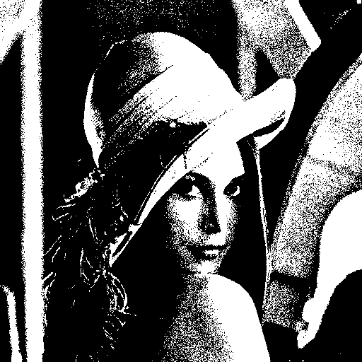 #include <stdio.h> #include <time.h> #include <stdlib.h> int main( int argc, char** argv ){ int i, j; unsigned char* src; unsigned char* dst; FILE* in; FILE* out; src = (unsigned char*)malloc(sizeof(unsigned char)*512*512); dst = (unsigned char*)malloc(sizeof(unsigned char)*512*512); srand(time(NULL)); in = fopen("lena512.raw", "rb" ); fread( src, sizeof(unsigned char), 512*512, in ); fclose(in); for( j = 0 ; j < 512 ; j++ ){ for( i = 0 ; i < 512 ; i++ ){ if( src[j*512+i] > 128 ) dst[j*512+i] = 255; else dst[j*512+i] = 0; } } out = fopen("lena512_thres.raw", "wb" ); fwrite( dst, sizeof(unsigned char), 512*512, out ); fclose(out); for( j = 0 ; j < 512 ; j++ ){ for( i = 0 ; i < 512 ; i++ ){ if( (src[j*512+i] + rand()%32 - 32) > 128 ) dst[j*512+i] = 255; else dst[j*512+i] = 0; } } out = fopen("lena512_dither_32.raw", "wb" ); fwrite( dst, sizeof(unsigned char), 512*512, out ); fclose(out); return 0; } |