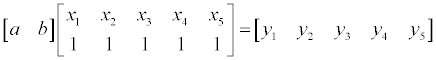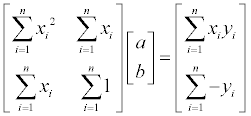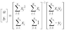 식을 정리하고 나니 아래와 같은 간단한(?) 행렬 연산을 통해 계수 a, b 를 계산해낼 수 있겠습니다.