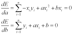 2차 곡선의 최소값은 기울기가 0이 되는 지점에 있으므로 a, b 각각에 대해 편미분을 한 뒤 기울기가 0 이 되는 지점을 찾습니다.