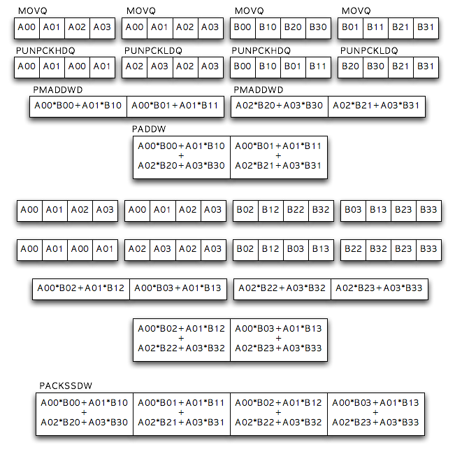 #include <stdio .h> // A matrix short s1[16] = { 1, 2, 3, 4, 5, 6, 7, 8, 9, 10, 11, 12, 13, 14, 15, 16, }; // Transpose(B matrix) short s2[16] = { 17, 21, 25, 29, 18, 22, 26, 30, 19, 23, 27, 31, 20, 24, 28, 32 }; // Destination matrix short d[16]; int j, i; int main( int argc, char** argv ){ __asm__("movq (s1), %mm0" ); __asm__("movq %mm0, %mm1" ); __asm__("movq %mm0, %mm2" ); __asm__("punpckhdq %mm2, %mm0" ); __asm__("punpckldq %mm2, %mm1" ); __asm__("movq %mm0, %mm6"); __asm__("movq %mm1, %mm7"); __asm__("movq (s2), %mm2" ); __asm__("mov $1, %eax" ); __asm__("movq s2(,%eax,8), %mm4"); __asm__("movq %mm2, %mm3" ); __asm__("punpckhdq %mm4, %mm2"); __asm__("punpckldq %mm4, %mm3"); __asm__("pmaddwd %mm2, %mm0"); __asm__("pmaddwd %mm3, %mm1"); __asm__("paddw %mm1, %mm0"); __asm__("movq %mm6, %mm1"); __asm__("movq %mm7, %mm2"); __asm__("mov $2, %eax" ); __asm__("movq s2(,%eax,8), %mm3" ); __asm__("mov $3, %eax" ); __asm__("movq s2(,%eax,8), %mm5"); __asm__("movq %mm3, %mm4" ); __asm__("punpckhdq %mm5, %mm3"); __asm__("punpckldq %mm5, %mm4"); __asm__("pmaddwd %mm3, %mm1"); __asm__("pmaddwd %mm4, %mm2"); __asm__("paddw %mm2, %mm1"); __asm__("packssdw %mm1, %mm0"); __asm__("movq %mm0, (d)"); for( j = 0 ; j < 4 ; j++ ){ for( i = 0 ; i < 4 ; i++ ){ fprintf( stderr, "\t%3d", d[j*4+i] ); } fprintf( stderr, "\n" ); } return 0; } |