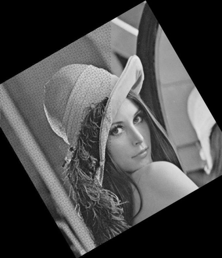 위 이미지는 512×512 사이즈의 lena 이미지를 z축을 기준으로 45도만큼 회전시킨 결과입니다. 왼 쪽은 단순히 forward mapping 을 해준 것이고 오른쪽은 weighted sum 을 이용해서 forward mapping 을 개선해준 것입니다.